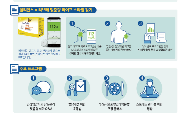 힐리언스는 프로그램 참여 고객이 평소 식습관에 대한 실시간 혈당패턴을 분석할 수 있도록 방문 3일전 리브레 키트(KIT)를 집으로 배송한다. 제공되는 키트는 채혈 없이 팔 등에 부착한 후 애플리케이션을 통해 혈당수치를 확인할 수 있다.