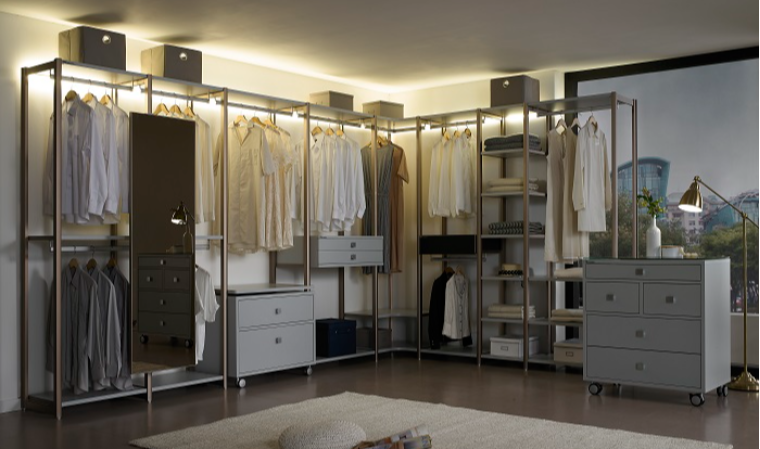 이번에 출시한 신제품 특징은 로즈골드 포스트와 그레이컬러 목대를 이용한 제품으로 LED 간접조명이 내장 되어있다. 서랍장 깊이가 500mm로 수납의 효율을 높였고 브론즈 컬러의 회전식 대형 전신거울과 빌트인 무선충전 콘센트가 있다. 드레스룸의 편리함과 활용도를 최상의 컨디션으로 올려 새롭고 세련된 디자인으로 제품의 완성도를 높였다.
