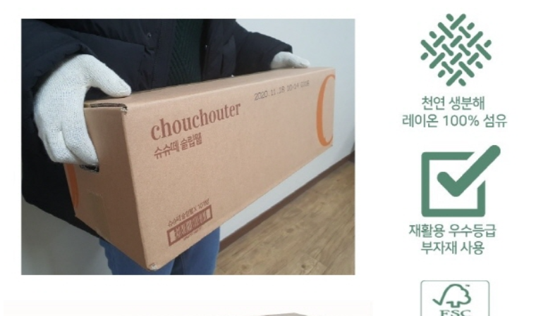한 상자의 무게는 16Kg에 이른다. 슈슈떼는 지난 11월 17일 초도 생산분부터 포장 상자에 착한 손잡이를 설치했고 국제산림관리협의회(FSC) 지속가능성 인증을 획득한 포장상자를 사용했다.