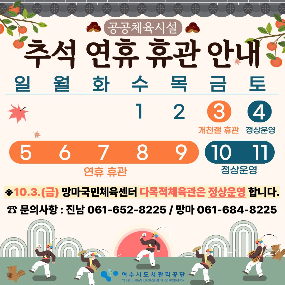 - 여수시도시관리공단, 추석 연휴 공공 체육시설 휴관 안내