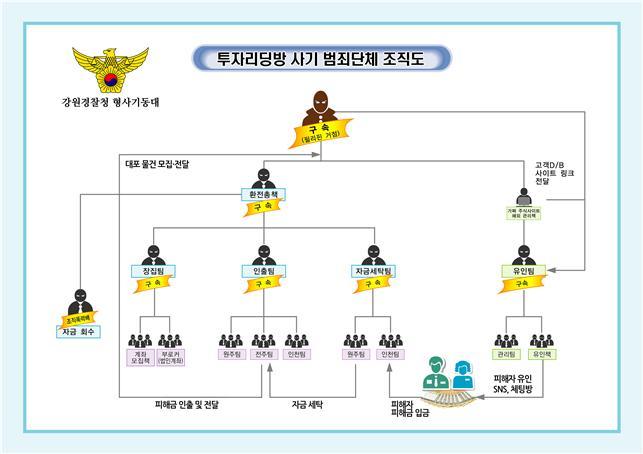 경찰에 따르면 총책 A는 ’22. 5월경 필리핀에 거점을 두고, 허위의 주식거래 사이트를 통해 피해자들을 유인하는 유인팀, 대포통장을 모집하는 대포통장모집책(장집), 범죄수익을 대포통장으로 송금해 추적을 어렵게 하는 자금세탁책, 범죄수익금을 현금으로 인출해 전달하는 인출책 등으로 역할을 분담한 리딩방 범죄단체를 조직했다.