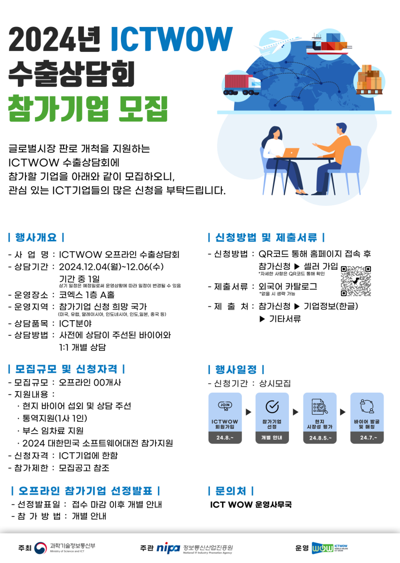 이번 ICTWOW 수출상담회에 참여하는 기업은 해외 바이어와의 1대 1 개별상담은 물론 2024소프트웨이브 전시 참여, 기업별 전시부스 지원 등 다양한 혜택을 제공해 국내 기업들의 효과적인 해외수출 지원을 기대할 수 있다.