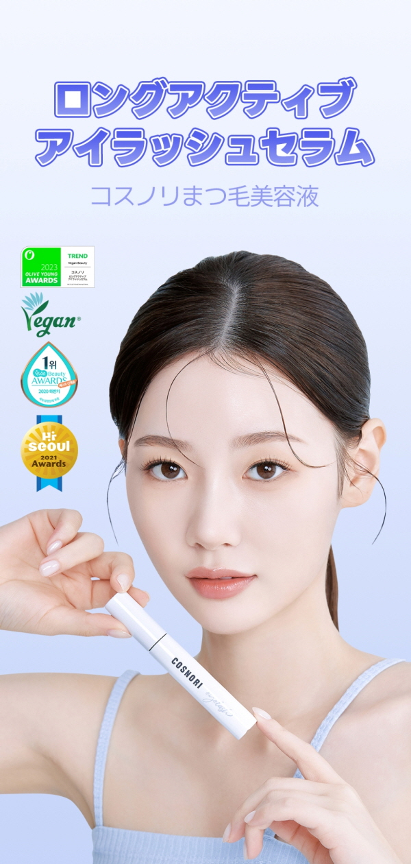 ‘코스노리 롱 액티브 아이래쉬 세럼’은 비건 속눈썹 영양제로 각종 뷰티 어워즈에서 수상한 바 있다. 특히 눈물과 같은 pH로 자극 없이 사용할 수 있으며, 특수 설계된 C컬형 브러시와 볼팁을 통해 속눈썹 모근까지 영양케어가 가능한 것이 특징이다. 고농축 펩타이드 특허 성분이 함유돼 손상된 속눈썹을 튼튼하게 관리하는데 탁월한 효과를 발휘한다.