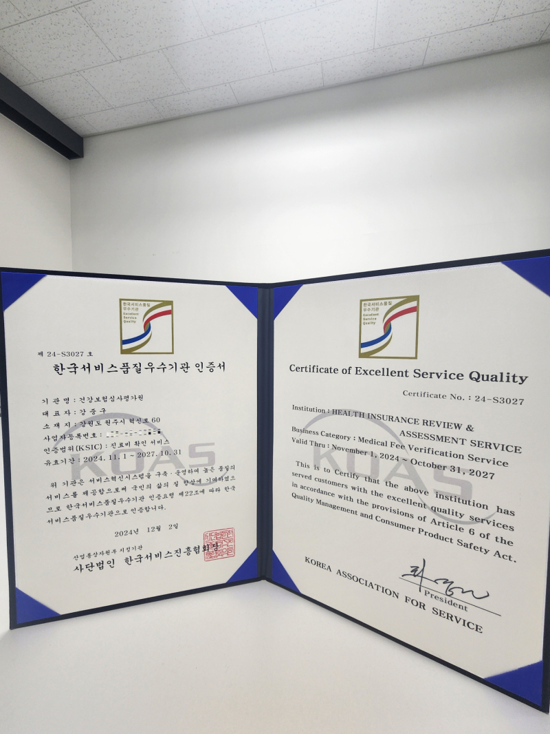 심사평가원의 ‘진료비확인 서비스’는 ▲리더십 ▲서비스품질 경영전략 ▲서비스 경영성과 등 7항목, 25개 평가지표를 기준으로 서류심사, 현장평가, 인증심사위원회 최종심의 등 객관적이고 엄정한 심사를 거쳐 우수한 서비스 품질을 인증받았다.
