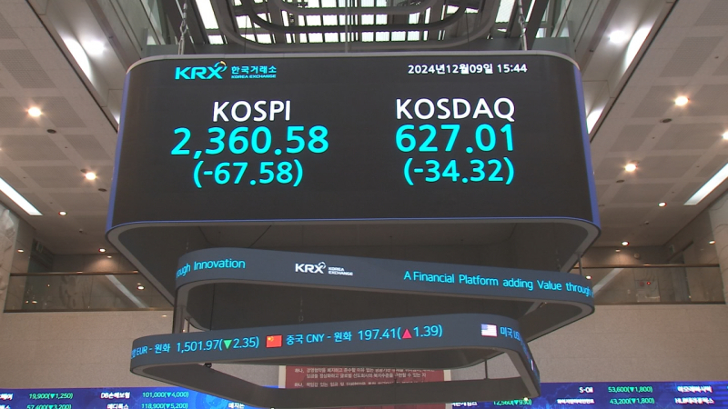계엄 선포 이튿날인 지난 4일 이후 4거래일 연속 주가가 내리면서 코스피는 5.58%, 코스닥 지수는 9.23% 하락했습니다. 이로 인해 양 시장의 시가 총액은 같은 기간 각각 113조원, 31조원 줄어 모두 144조원이 감소한 것으로 집계됐습니다.