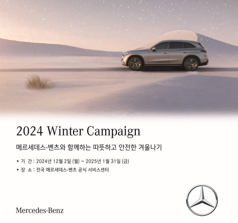 [서울경제TV=이수빈 인턴기자] 메르세데스-벤츠 코리아는 겨울철 안전하고 편안한 주행을 돕기 위해 통합 서비스 패키지 기간이 만료된 고객에게 프리미엄 전문 진단 서비스를 무상 제공하고 관련 부품을 할인하는 ‘2024 겨울맞이 캠페인’을 2025년 1월 31일까지 진행한다고 10일 밝혔다.
