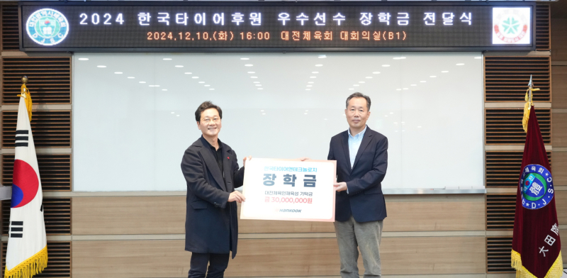 [서울경제TV=이수빈 인턴기자] 한국타이어앤테크놀로지(한국타이어)는 지난 10일 대전시 중구 부사동 대전시체육회관에서 이승찬 대전시체육회장, 김주형 한국타이어 문화담당 상무 등이 참석한 가운데 ‘2024 대전시 우수체육선수 장학금 전달식’을 진행했다고 11일 밝혔다.