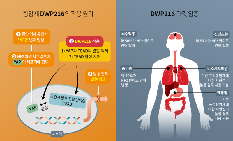DWP216은 NF2 변이로 발생하는 중피종과 뇌종양, 기존 항암제의 효과가 제한적인 비소세포폐암 및 췌장암 등의 암종에서 중요한 치료 옵션이 될 것으로 기대되고 있다.