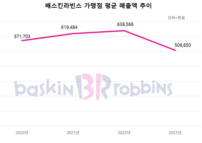 배스킨라빈스는 2020년 코로나19 사태에도 큰 타격 없이 꾸준히 상승세를 보여주던 프랜차이즈였다. 실제로 가맹점당 연 평균 매출액은 2020년 5억 7,170만3,000원 2021년은 6억 1,948만 4,000원 2021년에는 6억 3,856만 6,000원으로 안정적인 성장세를 보였다. 하지만 작년에는 가맹점당 평균 매출액은 5억 665만원을 기록하며 큰 폭으로 하향세를 나타냈다.