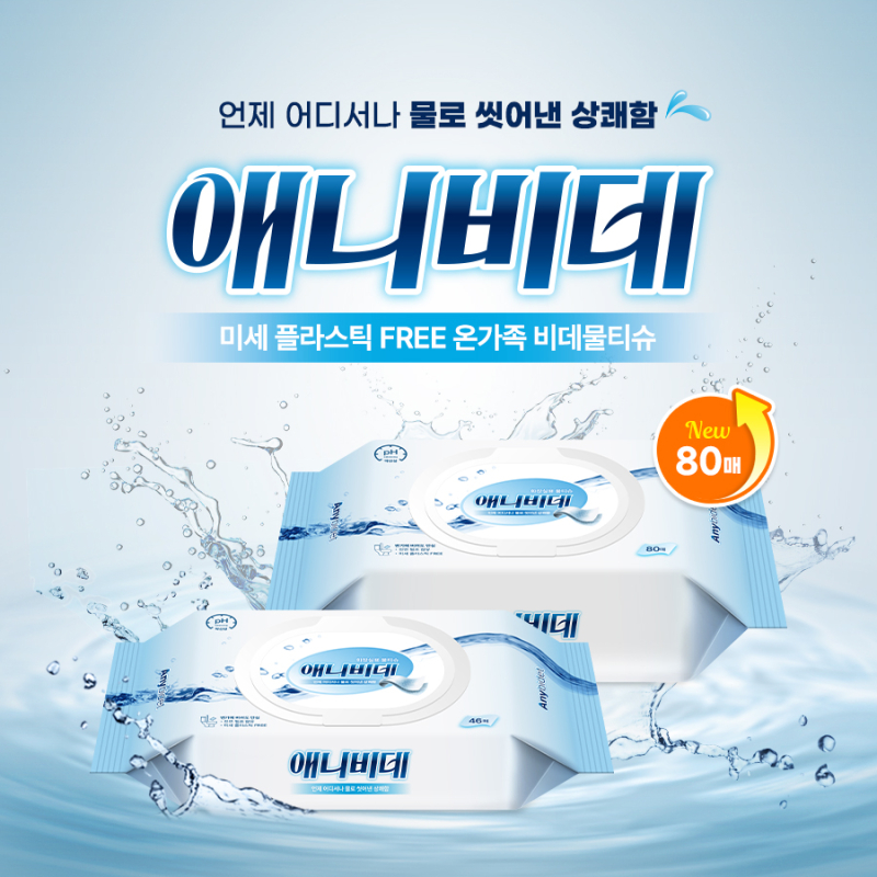 더퍼스트터치가 변기 막힘없이 물에 잘 풀어지는 비데 물티슈 ‘애니비데’를 80매 대용량으로 선보였다고 밝혔다.