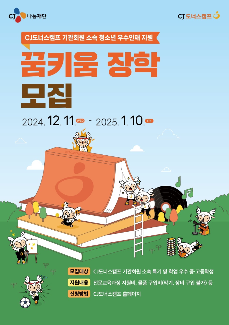 CJ나눔재단(이사장 이재현)이 2025년 1월 10일까지 취약계층 청소년의 학업 및 특기 분야 우수 인재 양성을 지원하는 ‘CJ도너스캠프 꿈키움 장학’ 프로그램 참여자를 모집한다고 밝혔다.