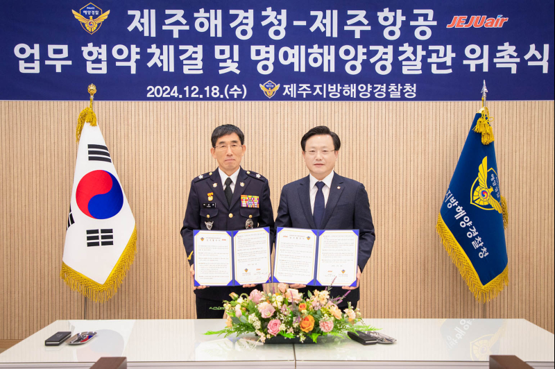 또 이날 협약식에서는 제주도 해양 환경 보호 활동에 앞장선 김이배 제주항공 대표이사를 명예 해양 경찰관에 위촉했다.