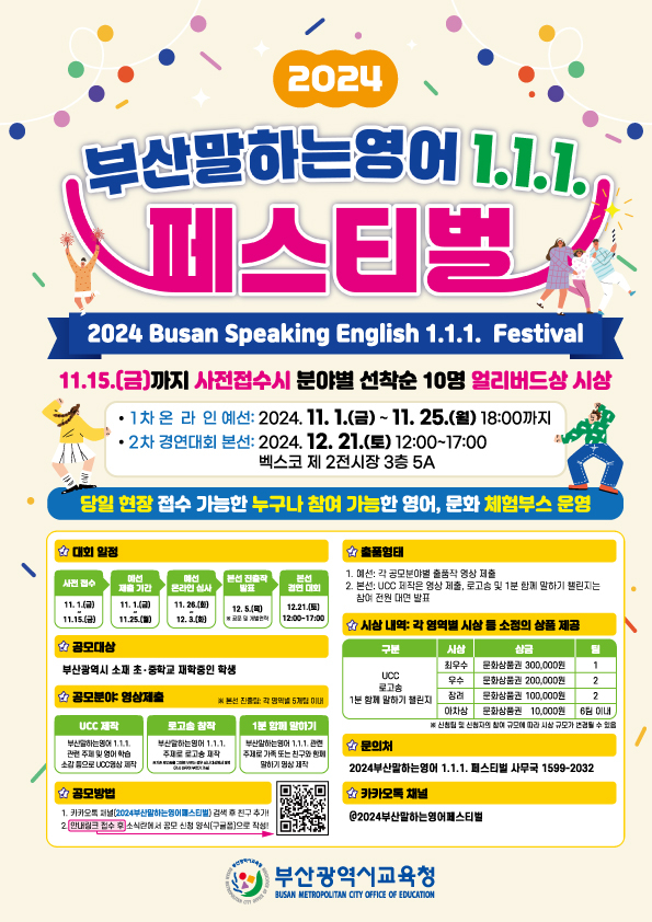 부산시교육청은 오는 21일 벡스코 제2전시장에서 초·중학생, 교사, 학부모 등 1000여명을 대상으로 '2024 부산말하는영어 1.1.1. 페스티벌'을 개최한다고 19일 밝혔다.