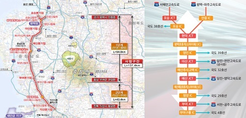 이번에 개통하는 평택∼부여 구간은 1단계 사업으로 총사업비 약 3조2천700억원이 투입된 왕복 4차로, 연장 94㎞ 규모이다.