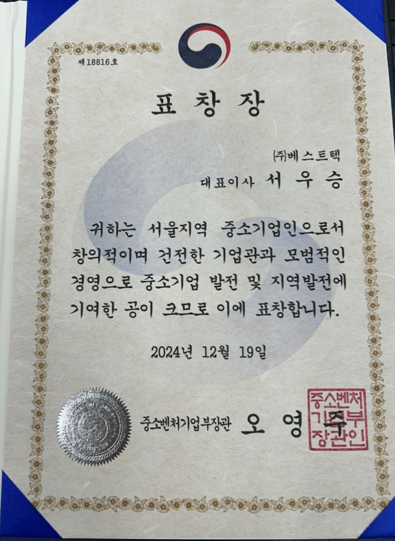 서우승 베스트텍 대표는 “중소기업이 지속적으로 성장하기 위해 필요한 것은 기술 혁신과 이를 뒷받침하는 환경”이라며 “이번 수상을 계기로 중소기업 생태계의 발전과 경쟁력 강화를 위해 더 많은 노력을 기울이겠다”고 포부를 밝혔다.