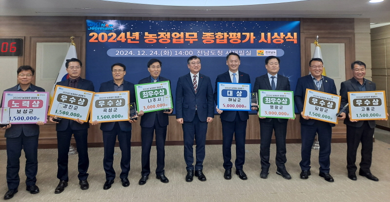 이번 종합평가와 함께 분야별 우수시군 평가에선 ▲친환경농업 육성 분야 대상에 해남군, 최우수상 고흥군, 우수상 담양군·진도군 ▲식량원예 분야 대상 강진군, 최우수상 화순군·해남군, 우수상 장성군·영광군·고흥군 ▲농식품유통 분야 대상 해남군, 최우수상 나주시·곡성군, 우수상 순천시·담양군·강진군·영광군이 수상했다.