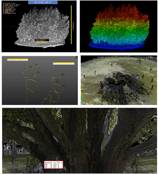 노거수의 수령조사는 보통 목편(Core)을 추출해 유전자(DNA)를 분석하는 것이 일반적이나 생육 중에 있는 천연기념물에서 직접적인 목편 추출이 어려워, 국립산림과학원은 수령추정 데이터베이스를 바탕으로 라이다(LiDAR) 스캔조사를 활용한 디지털 생장정보를 이용했다.