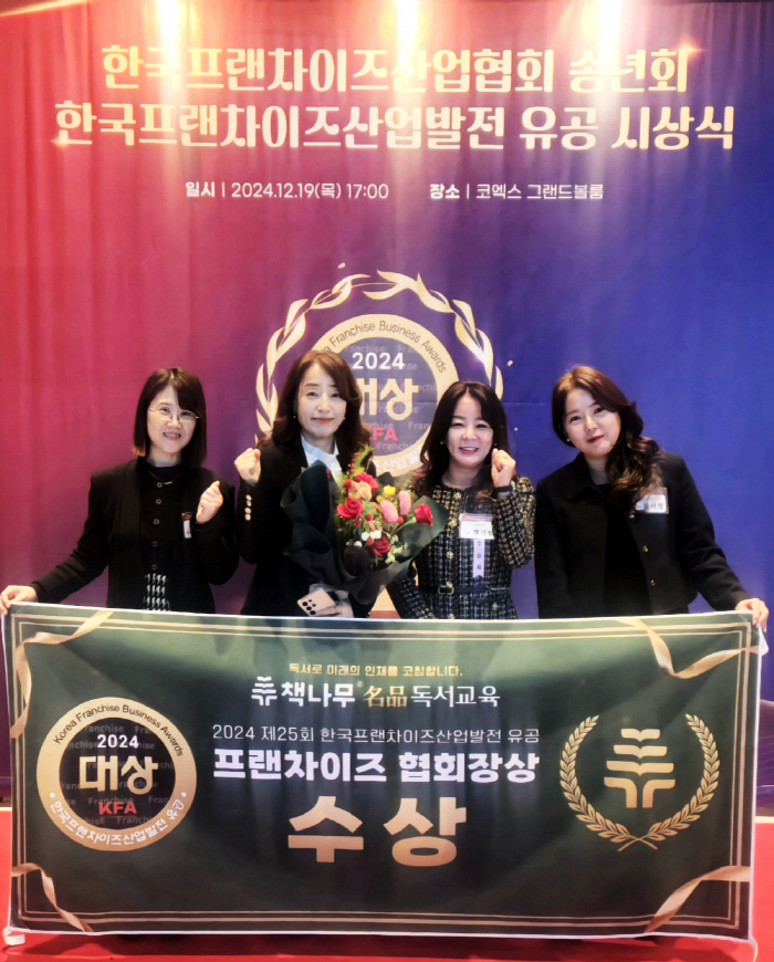 독서교육 전문 프랜차이즈 기업 책나무가 ‘2024 한국프랜차이즈산업발전 유공’에서 한국프랜차이즈 대상을 수상했다고 밝혔다.