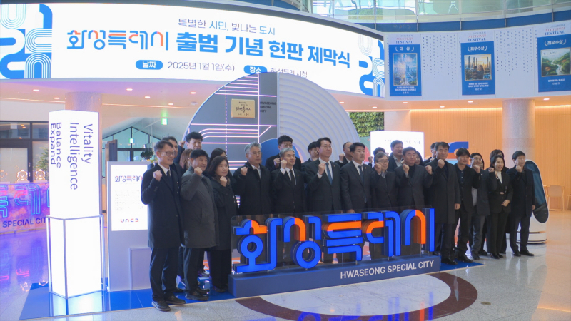 이날 행사는 시청 중앙 로비에서 정명근 시장을 비롯해 관계자들이 특례시 출범을 상징하는 현판과 화성특례시민헌장을 제막하며 미래 발전을 기원했습니다.