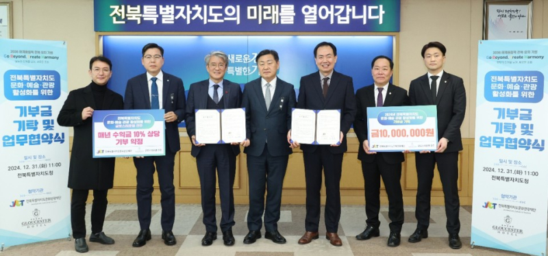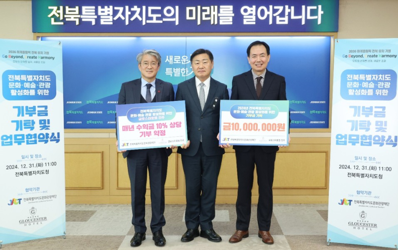 [서울경제TV=정창신기자] 글로스터호텔그룹은 지난달 31일 전북도청에서 전북특별자치도 문화관광재단과 관광·문화·예술 산업 발전의 지속과 가능성 도모를 위한 업무협약을 체결했다고 2일 밝혔다.