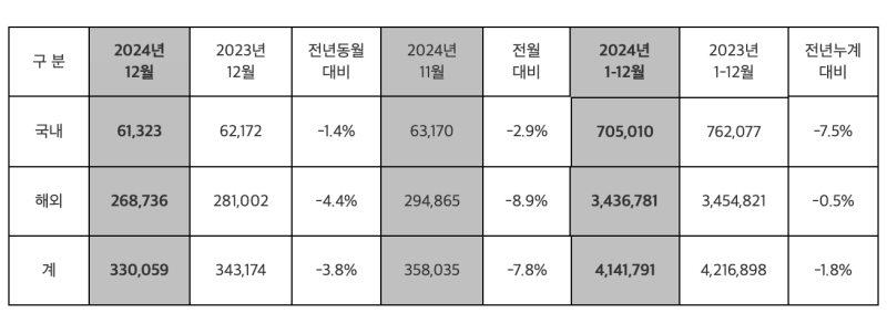 이는 지난 2023년과 비교해 국내 판매는 7.5% 감소, 해외 판매는 0.5% 감소한 수치다.