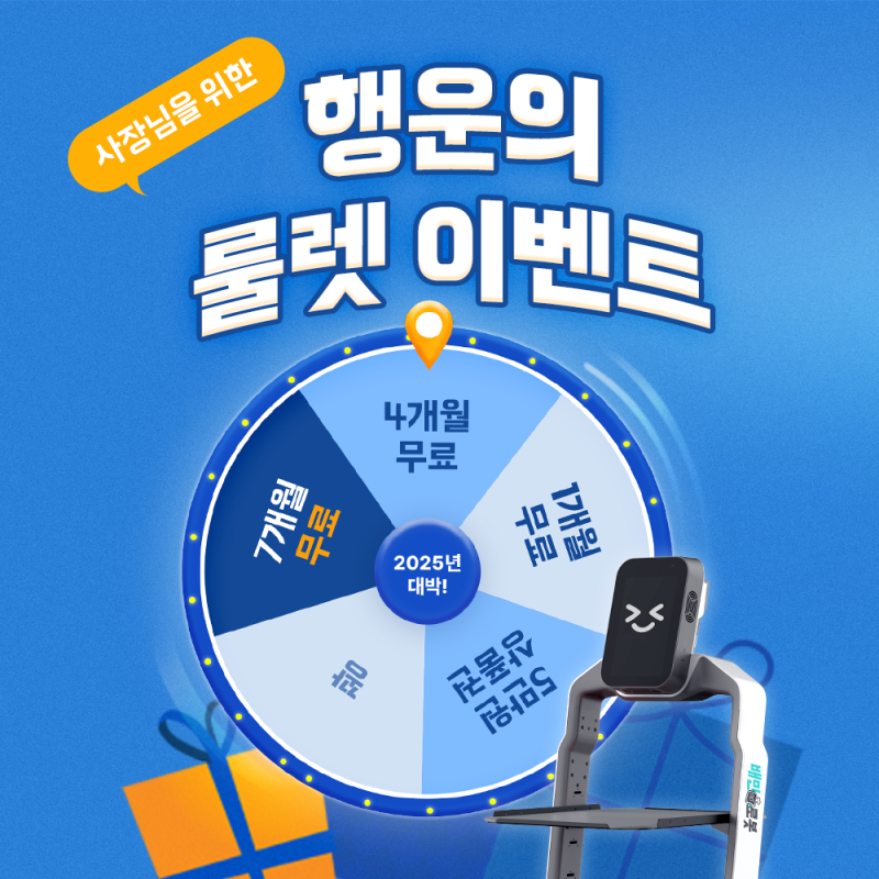 이번 1월 한 달간 진행되는 ‘행운의 룰렛 이벤트’에서는 서빙로봇 납입료 최대 1년 무상 혜택을 제공한다. 또한 안심케어 서비스도 계약기간 동안 무상으로 지원되며, 설치비 면제를 비롯해 서빙로봇 이용을 돕는 웰컴 패키지, 가게 홍보를 위한 로봇 커스텀 홍보물 등 다양한 혜택도 제공왼다.