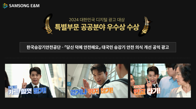 ㈜삼송이앤엠홀딩스(삼송E&M)는 한국디지털광고협회가 주관하는 국내 디지털 광고 분야 최고 권위의 광고제 ‘2024 대한민국 디지털 광고대상(KODAF 2024)’에서 공익광고 ‘당신 덕에 안전해요’로 특별부문 내 공공분야 우수상을 수상했다고 밝혔다.