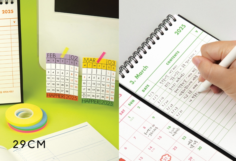 다이어리나 노트를 꾸미기 위한 스티커, 마스킹테이프 등 문구 소품도 관심이 높아졌다. 디자인 브랜드 키티버니포니가 출시한 ‘마스킹테이프’는 감각적인 패턴 디자인과 좋은 품질로 29CM 대표 인기 제품으로 자리매김했다. 또 새해 캘린더도 취향을 고려하는 경향이 강해졌다. 귀여운 캐릭터 그래픽을 주력으로 하는 브랜드 다이노탱이 출시한 ‘2025년 새해 캘린더‘는 따뜻하고 감성적인 취향을 선호하는 고객들에게 큰 관심을 받고 있다.