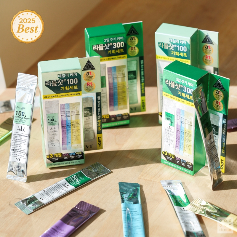 올해 큰 화제를 모았던 뷰티용품은 세트 구성으로 새롭게 선보인다. ‘VT 리들샷 100 기획 세트(6+1)’는 '리들샷 100 페이셜 부스팅 퍼스트 앰플' 3개와 VT의 고효능 에센스 3종, '리들샷 500 페이셜 부스팅 퍼스트 앰플’을 합쳐 준비했다.