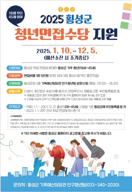 군은 '횡성군 청년 기본 조례'제14조에 따라 횡성군에 거주하는 청년의 적극적인 구직활동을 지원하기 위해 '횡성군 청년 면접 수당 지원사업'을 진행 중이다.