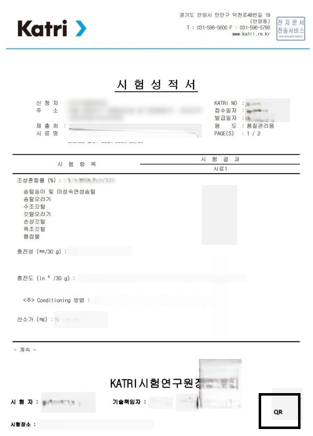 KATRI, FITI, KOTITI는 섬유, 소재·부품, 화학, 생활용품 등 다양한 분야의 시험·검사·인증을 수행하는 국제 공인 시험인증기관들이다. 인증 기관에 의류 샘플을 보내 검사를 신청하면 혼용률, 우모시험, 기능성 시험 등을 진행한다. 시험 과정이 모두 끝나면 시험 기관에서 업체 측으로 결과를 발송한다. 검사 기관에서 보낸 성적서에는 조성·우모혼합률 등 시험항목의 결과가 수치 및 적합여부로 기재된다.