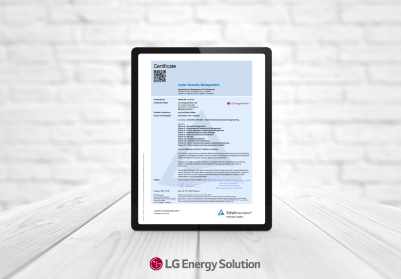20일 LG에너지솔루션은 국제 시험 인증 기관 TÜV라인란드(티유브이 라인란드)로부터 국제표준 ISO/SAE 21434 기반의 자동차 사이버보안 관리체계(CSMS) 레벨3 인증을 획득했다고 밝혔다.