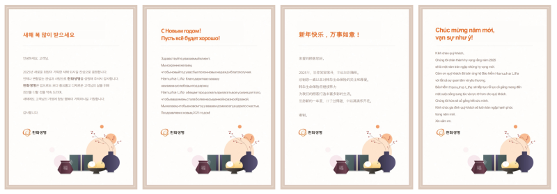 다국어 연하장은 설 연휴 전 외국인 및 귀화 고객들에게 익숙한 언어로 발송될 예정이다. 다국어 안내장에는 보험금 접수 방법, 계약자 변경 방법, 보험계약 대출, 보험자산분석, 건강체 할인 방법, 증권 재발행 방법, 보험료 납입 방법 등이 기재돼 있다.
