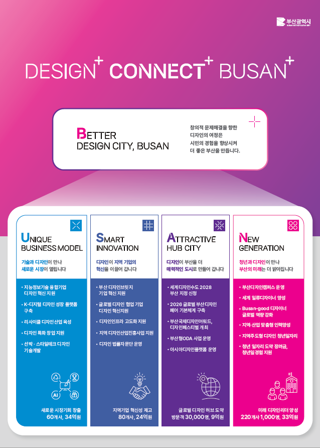 4대 분야는 ▲디자인 융합 신산업 육성(34억원) ▲지역 기업 디자인 혁신성 제고(24억원) ▲글로벌 디자인 허브 도시 도약(9억원) ▲미래 디자인 리더 양성(33억원) 등이다.