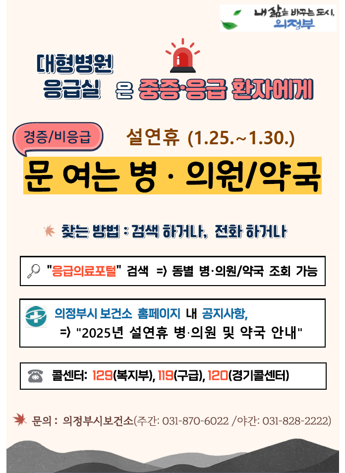 시는 22일, 설 연휴 기간인 1월 25일부터 30일까지 6일간 ‘응급진료 상황실’을 열어 응급환자 발생에 대비하고 시민들에게 '문 여는 병‧의원 및 약국’을 안내한다.
