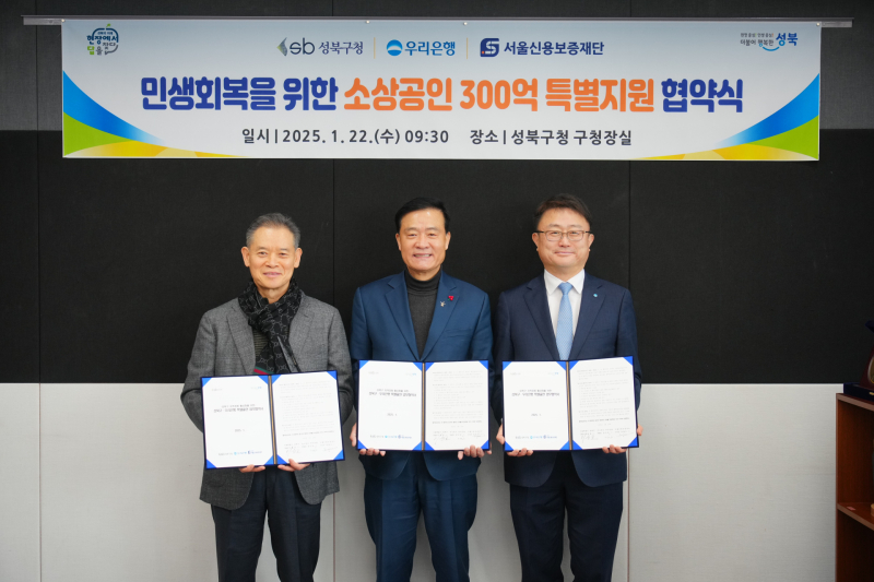 [서울경제TV = 이연아 기자] 우리은행이 22일 서울 성북구청, 신용보증재단과 성북구 소상공인 금융지원을 위한 업무협약을 체결했다.