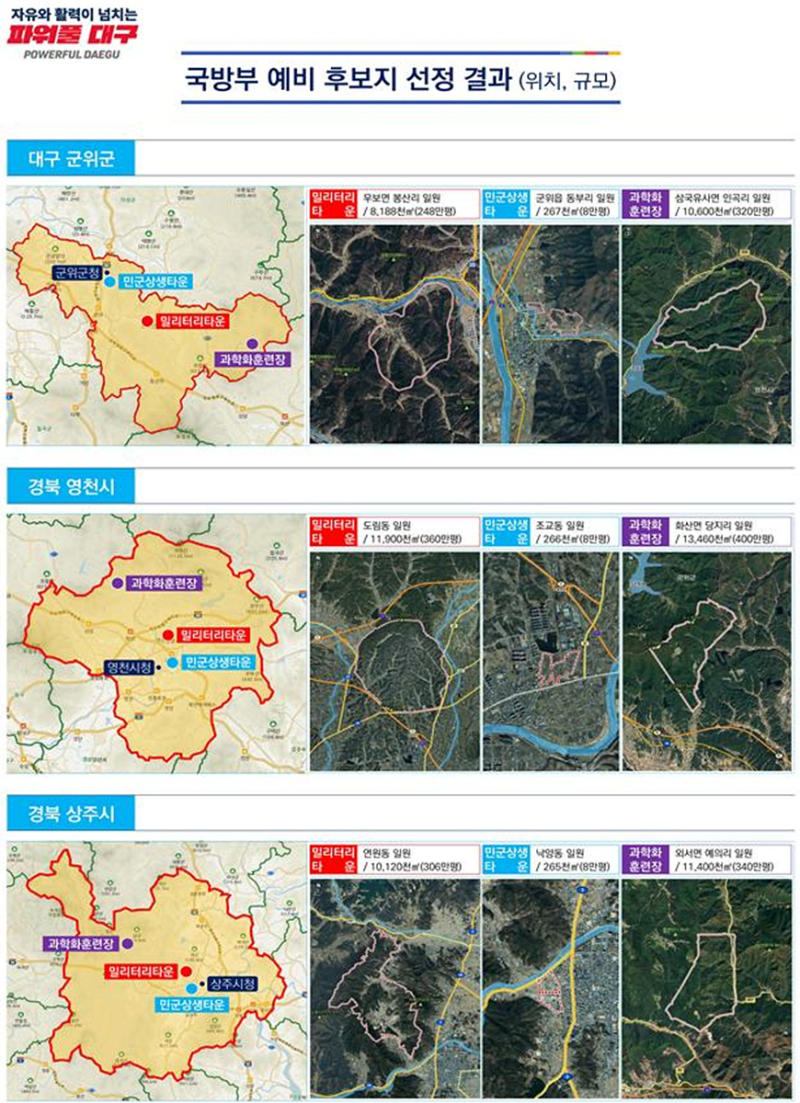 선정된 예비후보지는 군위군·영천시·상주시 등 3개 지역으로, 작전·군수·복지 등 군 기능별 임무수행이 용이하고 훈련 효과를 발휘하기에 적합한 것으로 평가됐다.