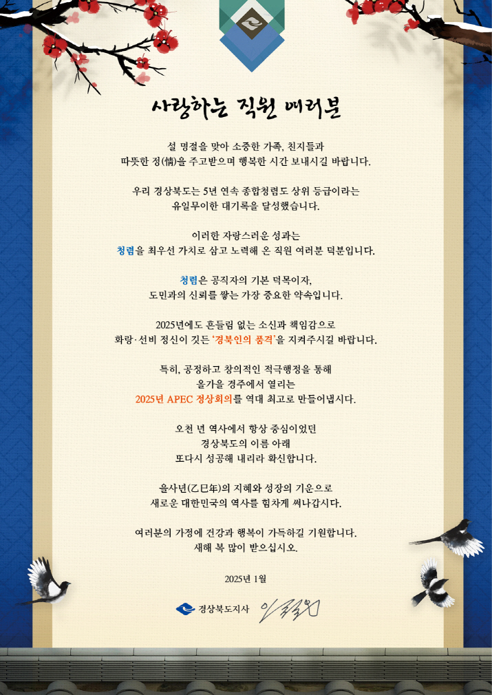 [서울경제TV 대구=김정희 기자] 이철우 경상북도지사는 설 명절을 앞둔 23일 내부 행정시스템을 통해 청렴 서한문을 발송하고 청렴 특별도 경상북도를 만들기 위한 실천에 전 직원이 동참할 것을 당부했다.
