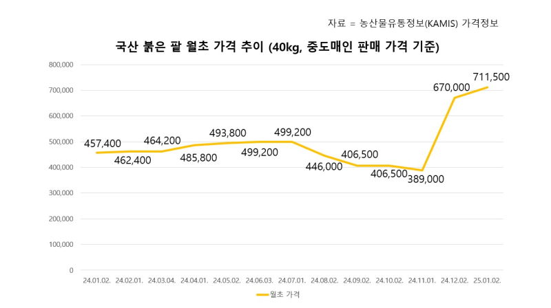 물가 상승 역시 붕어빵 가격이 오르거나 노점이 폐점되는데 한몫을 톡톡히 했다. 농산물유통정보(KAMIS)에 따르면 붕어빵 속재료로 쓰이는 팥(국산 붉은 팥, 40kg, 중도매인 판매 가격 기준)의 경우 2024년 1월부터 11월까지 약 40~50만 원대로 그 가격이 유지되다가 12월(2일 기준) 67만 원으로 가격이 껑충 뛰었다. 다음 달인 2025년 1월도 71만1,500원으로 상승세를 이어갔다. 노점 점주 B 씨가 과거 세 마리에 1,000원에 팔던 붕어빵을 이제는 2,000원에 팔수밖에 없는 이유다.