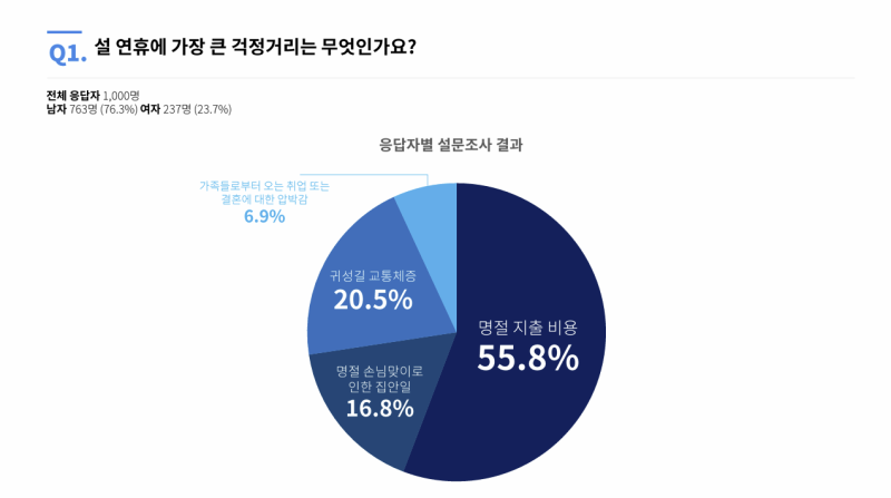 이어 명절 손님맞이로 인한 집안일(16.8%), 귀성길 교통체증(20.5%), 가족들로부터 오는 취업 또는 결혼에 대한 압박감(6.9%)이 뒤를 이었다.