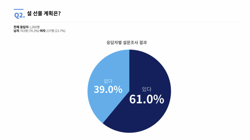 이번 설문조사는 지난 21일과 22일 국내 소비자 1000명을 대상으로 진행됐다. 조사결과 응답자의 약 61%가 설 선물을 준비할 계획이 있다고 답했으며, 39.0%는 계획이 없다고 답했다.