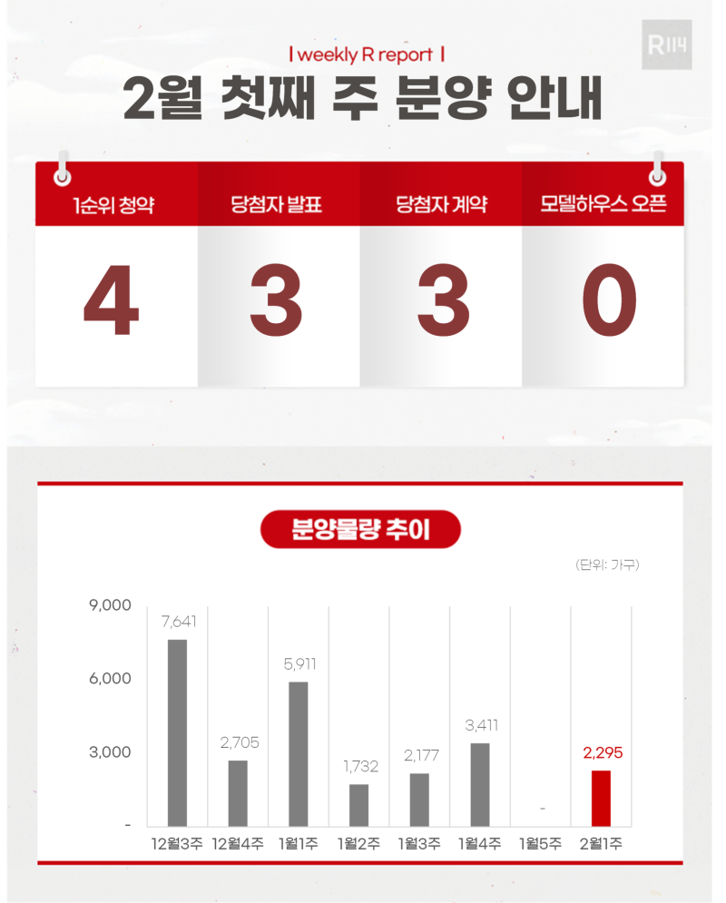 25일 부동산R114에 따르면 2월 첫째 주 전국 4개 단지에서 총 2,295가구(일반분양 925가구)가 청약을 받는다.