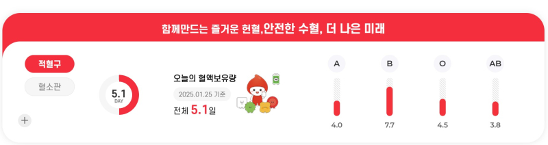혈액형별 혈액 보유량은 AB형이 3.5일로 가장 적었고, A형(3.8일), O형(4.4일)도 5일분 미만이었다. B형(7.5일)은 상대적으로 보유량이 넉넉한 편이었다.
