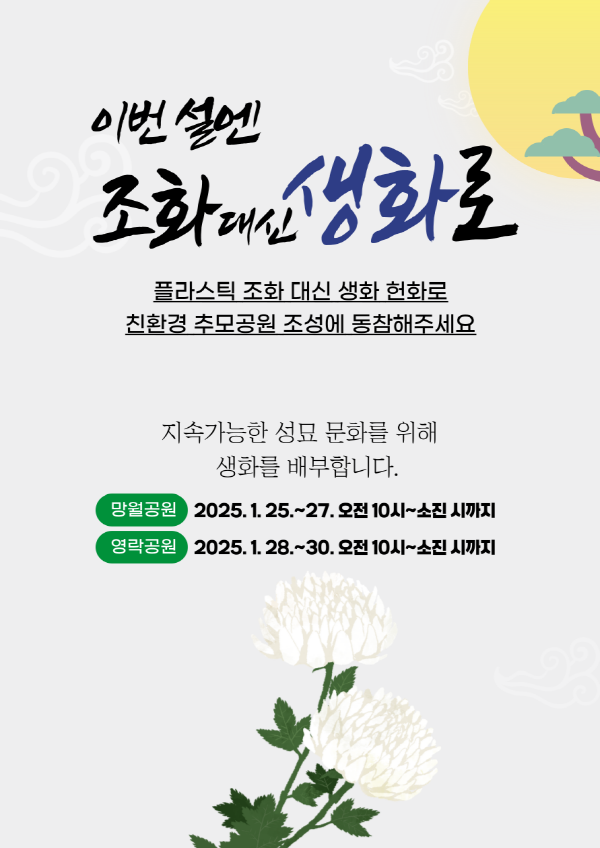 광주광역시(시장 강기정)와 광주도시공사는 설 명절 기간 망월묘지공원과 영락공원에서 생화를 배부하며 ‘플라스틱조화 없는 친환경 추모공원 캠페인’을 추진한다.