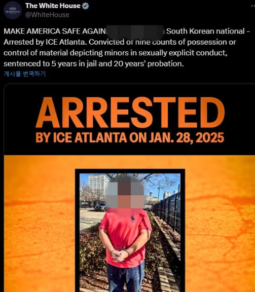 백악관은 엑스(X·옛 트위터) 계정에도 해당 사실을 게시했다. 게시물에 따르면 한국 국적자 임모씨는 아동 포르노 소지 혐의로 징역 5년 및 보호관찰 20년형을 받았다.