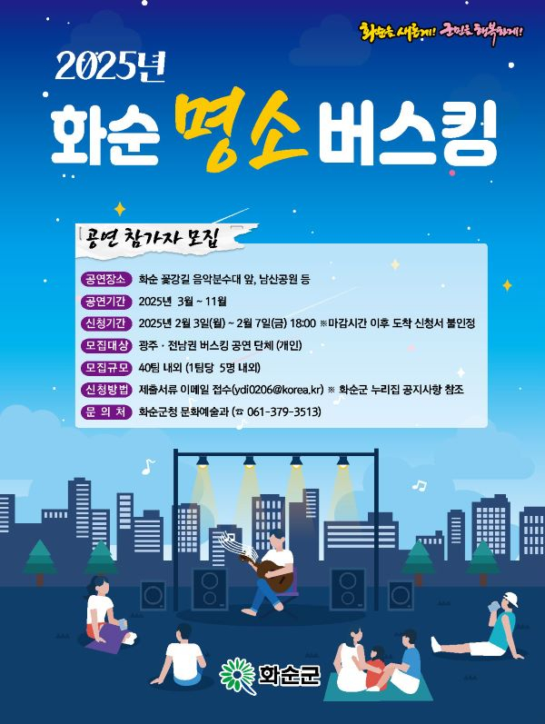 공모 신청 대상자는 음향 별도 지참이 가능한 광주·전남권 버스킹(길거리 공연) 단체 혹은 개인이며, 화순 명소를 찾는 관광객들에게 다채로운 공연을 제공하기 위해 음악(대중가요, 밴드 등), 악기, 마술 등 다양한 장르의 공연자를 모집할 계획이다.