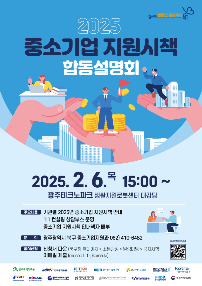 [서울경제TV 광주=류재혁 기자] 광주시 북구(구청장 문인)가 오는 6일 오후 3시 광주테크노파크 생활지원로봇센터 대강당에서 17개 유관기관과 함께 ‘2025년 중소기업 정책 간담회 및 지원시책 합동 설명회’를 개최한다고 밝혔다.