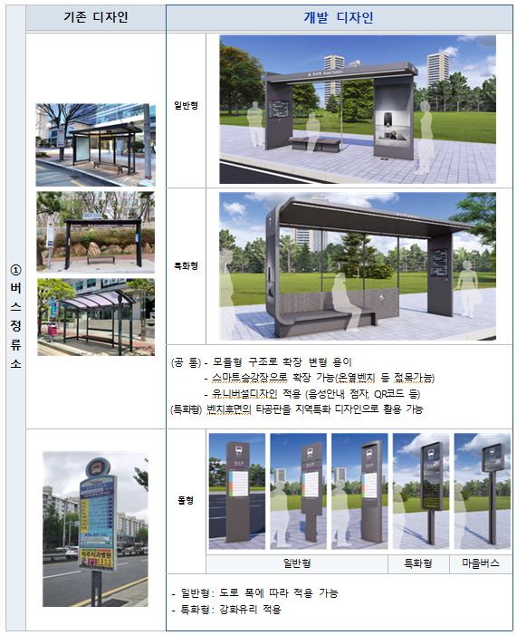 이번에 개발된 표준디자인은 버스정류소, 맨홀 덮개, 안내표지판(공개공지, 공공보행통로) 등 모두 3종의 공공시설물에 적용됐다. 이용자의 편의성과 시설의 기능성을 강화하고 시 경관과 어울릴 수 있는 디자인을 구현하는 데 중점을 뒀다.