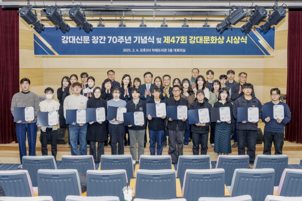 정재연 총장은 “강대신문은 지난 70년 동안 우리 대학의 목소리를 대변하며 언론의 품격과 소명을 지켜왔다”며 “앞으로도 대학의 변화와 비전을 지역과 세계에 알리는 데 중추적인 역할을 수행해주길 기대한다”고 밝혔다.