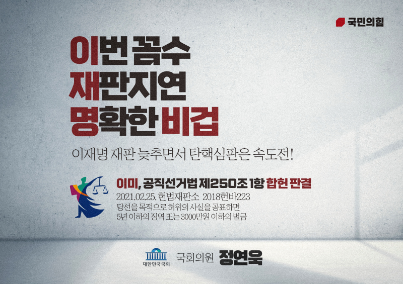 정연욱 의원은 “탄핵심판에는 속도전을 요구하면서 정작 본인 재판은 지연시키는 ‘아시타비’(나는 맞고 남은 틀리다)의 전형”이라고 질타했다.